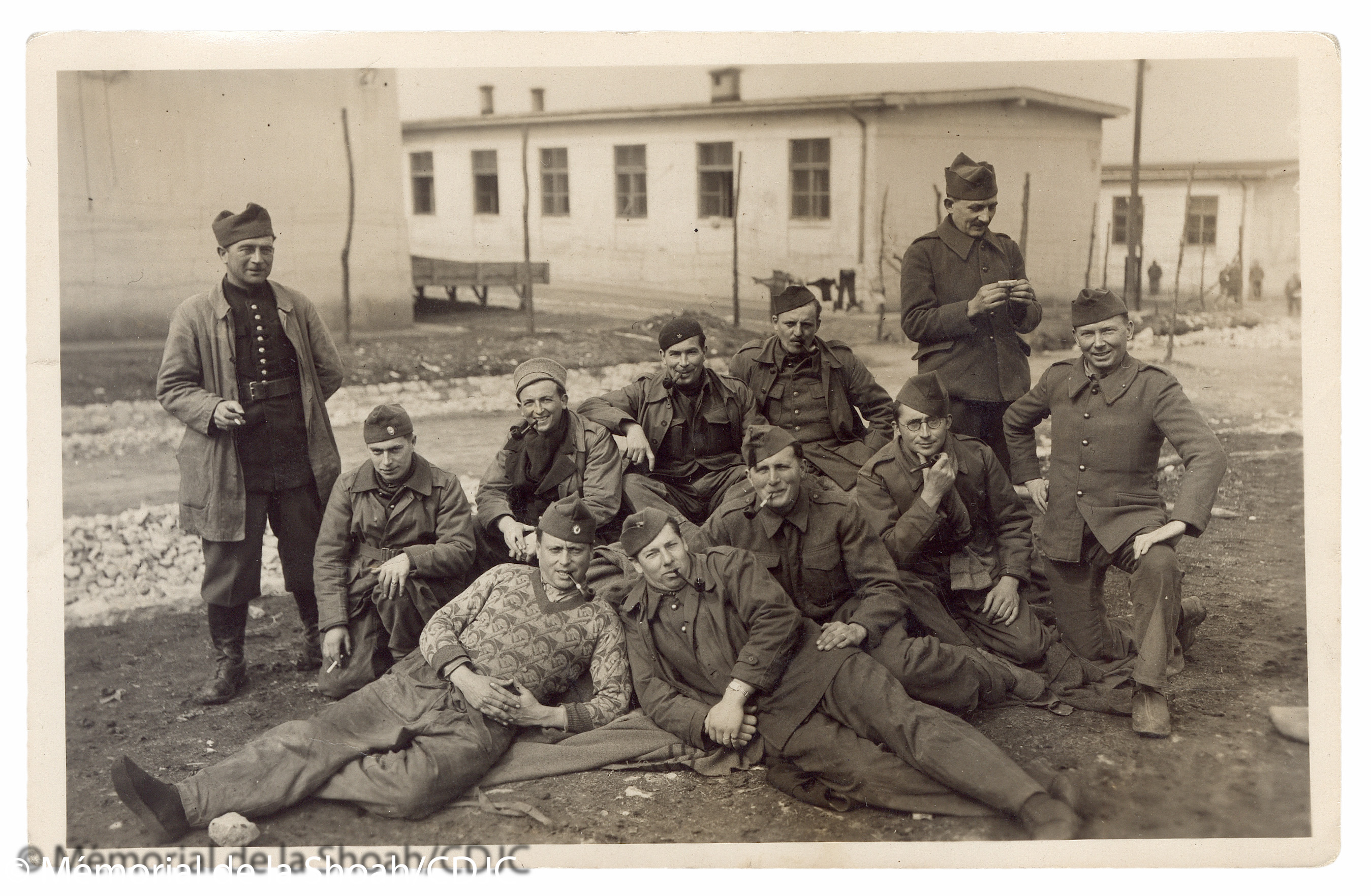 16 juin 1940 – 3 avril 1941 : Stalag XVII A à Kaisersteinbruch 1 sur 1 Il est interné comme Prisonnier de Guerre (P.G.) dans ce stalag de la 17è région militaire du Reich nazi, d’où il tenta de s’évader. [photo : Jacques Jacob au Stalag, à gauche debout avec une cigarette à la main. A ce jour il m’est impossible de dire si c’est dans ce stalag ou le second, à Hemer où il fut transféré ensuite. – Fonds Lisette Gal-El].