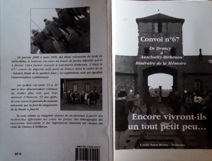 4è de couverture et couverture de livre autopublié pour mes élèves dans le cadre du projet pédagogique sur la Shoah « Convoi 67 : encore vivront-ils un tout petit peu…). Livre tiré uniquement à 100 exemplaires pour les élèves, enseignants du lycée et institutions ou fondations ayant participé au projet en 2008-2009.