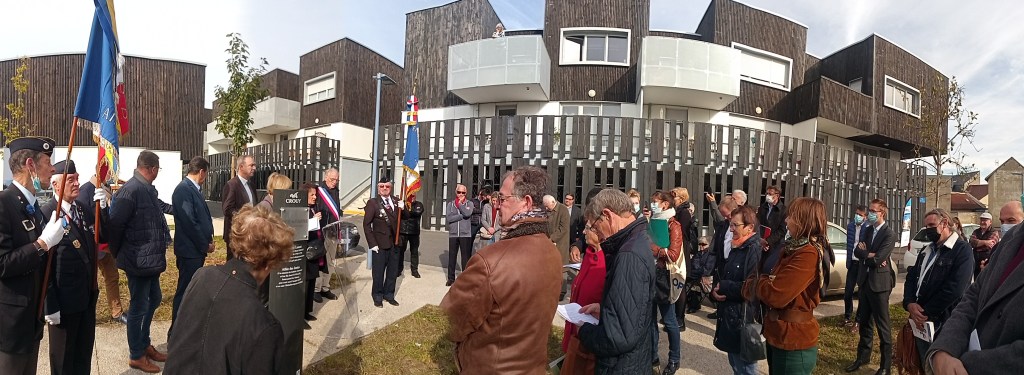 Ce matin, à Crouy, petite commune au pied d’un plateau dominant la vallée de l’Aisne et la ville de Soissons, on honore la force du bien devant une trentaine de personnes. Dans une Allée des Justes fraichement baptisée, au coeur d’un nouveau lotissement, s’érige désormais une stèle commémorative aujourd’hui dévoilée. Elle révèle à la mémoire collective de la ville et des passants les noms de Germaine Cuvillier (1897-1983), de son époux Gabriel (1887-1971) et de leur fils Jean (1924-1984), humbles figures disparues de la bourgade, pour avoir caché et sauvé de janvier à août 1944 deux enfants crouyssiens juifs qui échappèrent in extremis aux escouades de la Sipo-SD allemande sillonnant les routes de l’Aisne un 4 janvier 1944 pour remplir leurs wagons de déportation vers l’extermination à Birkenau : Micheline (10 ans à cette époque), et son petit frère de 4 ans, Jaques Katz. Je ne reviendrai pas dans cet article sur leur histoire, je l’ai patiemment et douloureusement écrite dans mon livre publié en 2017 : La Shoah en Soissonnais, journal de bord d’un itinéraire de Mémoire. Les quelques lecteurs de cet ouvrage sauront les reconnaître.
