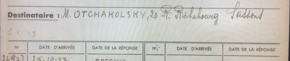 Il s’agit d’un formulaire d’enregistrement de deux courriers envoyés par WAISFELNER J., arrivées le 25 octobre 1943, destiné à M. OTCHAKOLSKY, domicilié au 20 rue Richebourg à Soissons. Ainsi que les deux dates correspondantes à ses réponses (6 décembre 1943 et 5 janvier 1944.