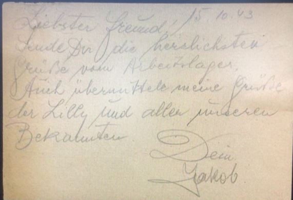 Très cher ami, Je t’envoie mes salutations les plus cordiales du camp de travail et transmets mes salutations à Lily et à toutes nos connaissances.
