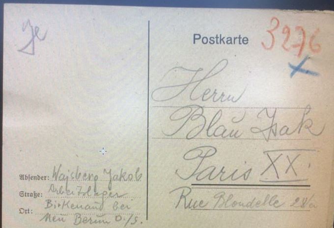 S’il m’est permit, prenons cet exemple, un parmi tant d’autres qui cache tant d’agonie : une carte-lettre écrite le 15 octobre 1943 par Jakob Wajsberg au « Arbeitslager » de Birkenau à Isak Blau, domicilié au 28 rue Blondelle, Paris XXe, est arrivée le 29 novembre 1943 au bureau de l’UGIF. Le destinataire n’a pu venir la récupérer ce qui explique la présence de cette Postkarte dans le fonds d’archives.