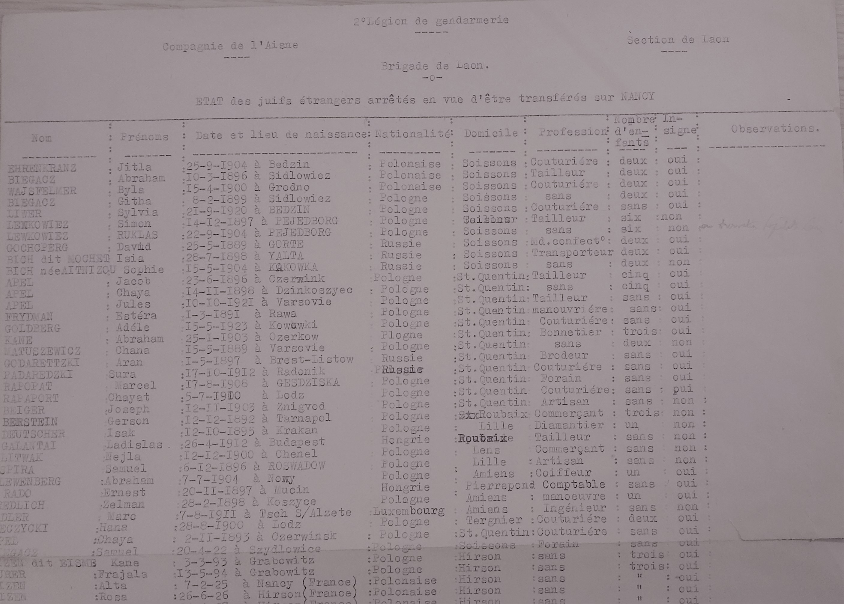 Conformément à ces instructions, ces opérations ont été effectuées par les soins de la gendarmerie française et, ce matin, 65 Israélites se trouvaient rassemblés à Laon, dans un local que j’avais prévu pour les accueillir.