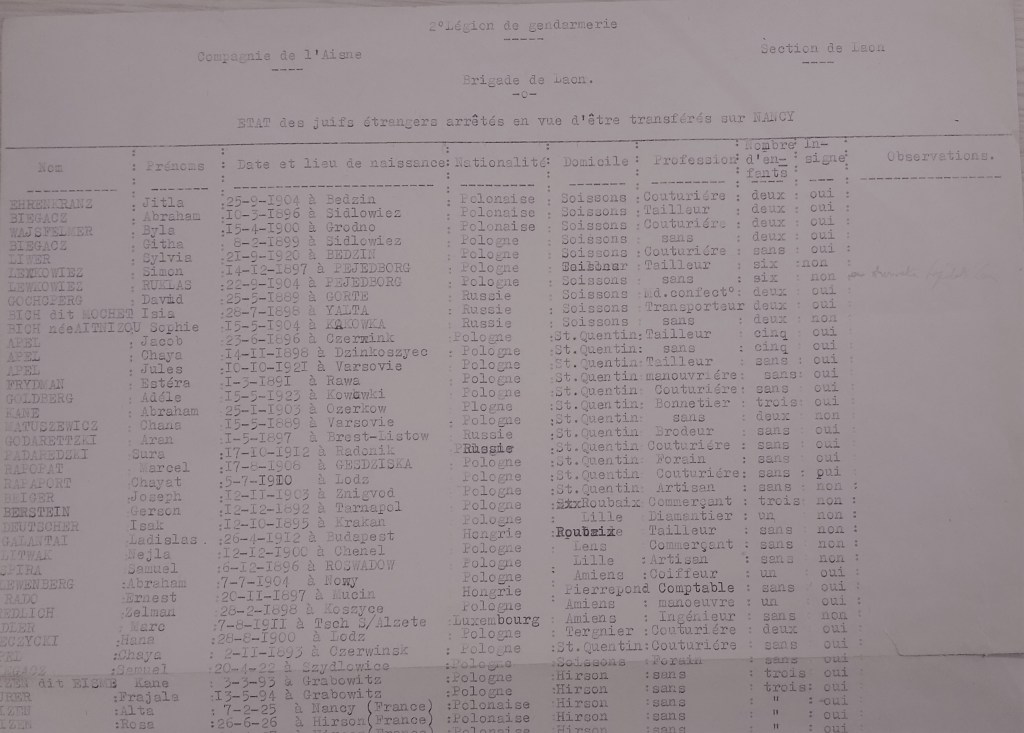 D’Amiens à Soissons, de Compiègne à Saint-Quentin, 65 juifs [sur 79 prévus] furent arrêtés et rassemblés à Laon avant d’être transférés le 21 juillet 1942 au camp de Drancy en banlieue parisienne.