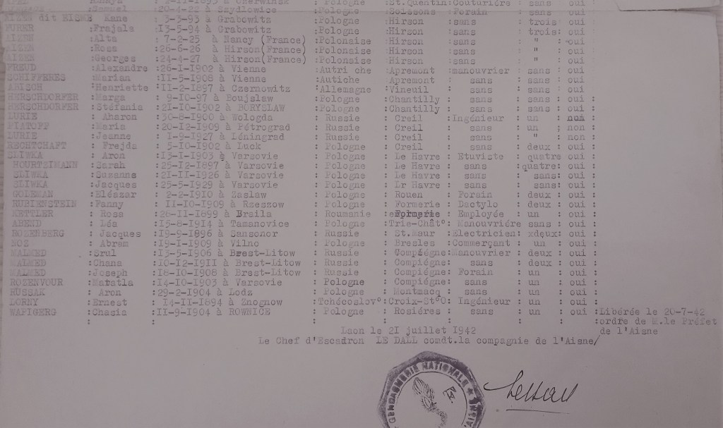 21 juillet 1942, le chef d’escadron Le Dall, commandant de la compagnie de gendarmerie de l’Aisne, en bas d’une liste de 65 juifs, signe et saigne le destin de dizaines de familles. Il n’avait pas forcément connaissance du devenir de ces innocents. Mais sa responsabilité à les arrêter ; parce que nés dans un lit plutôt qu’un autre, de surcroît aux nationalités étrangères, avait-elle écorché sa conscience ?
