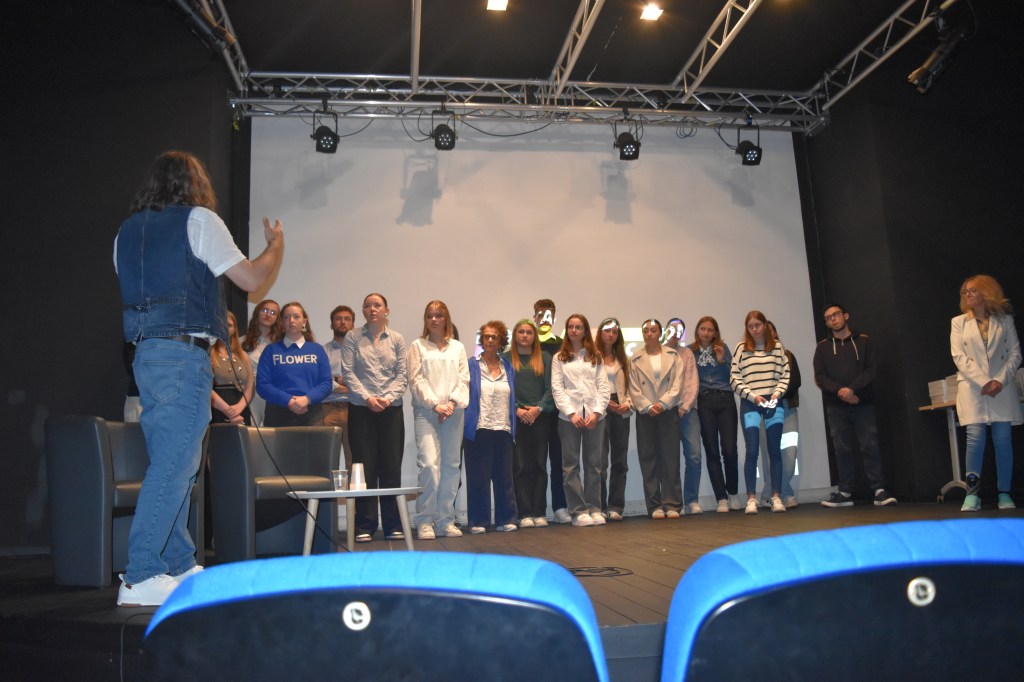 Les 130 sièges de l’auditorium sont quasi tous occupés et sur la scène, entourés de mes collègues, nous commençons à rappeler quelques aspects et la nature du projet. Puis, les lumières s’éteignent, je me dirige vers la console en bas de la scène pour lancer, en avant première, la projection de notre film documentaire, un long métrage d’1h23′ : Sur les traces de Bella, Rosa, Gitla, Sophia (et leurs proches) à Auschwitz. Je vous avoue que je n’en menais pas large. C’était la première fois que je me lançais dans la production (financée en grande partie le CARDIE du Rectorat d’Amiens), la réalisation, bref tout le montage, composition de la musique comprise pour plusieurs séquences. Mes inquiétudes se sont vites dissipées lorsque j’observais les visages de tous les spectateurs, complètement embarqués, pris par l’émotion, jusqu’au générique de fin. Les applaudissement nous firent très chaud au coeur. Notre plus grande satisfaction, c’est la sincère et profonde admiration de nos élèves à se voir et à s’entendre sur le grand écran. Ils découvraient, eux aussi, ce film dans son montage final qu’ils étaient impatient de voir.