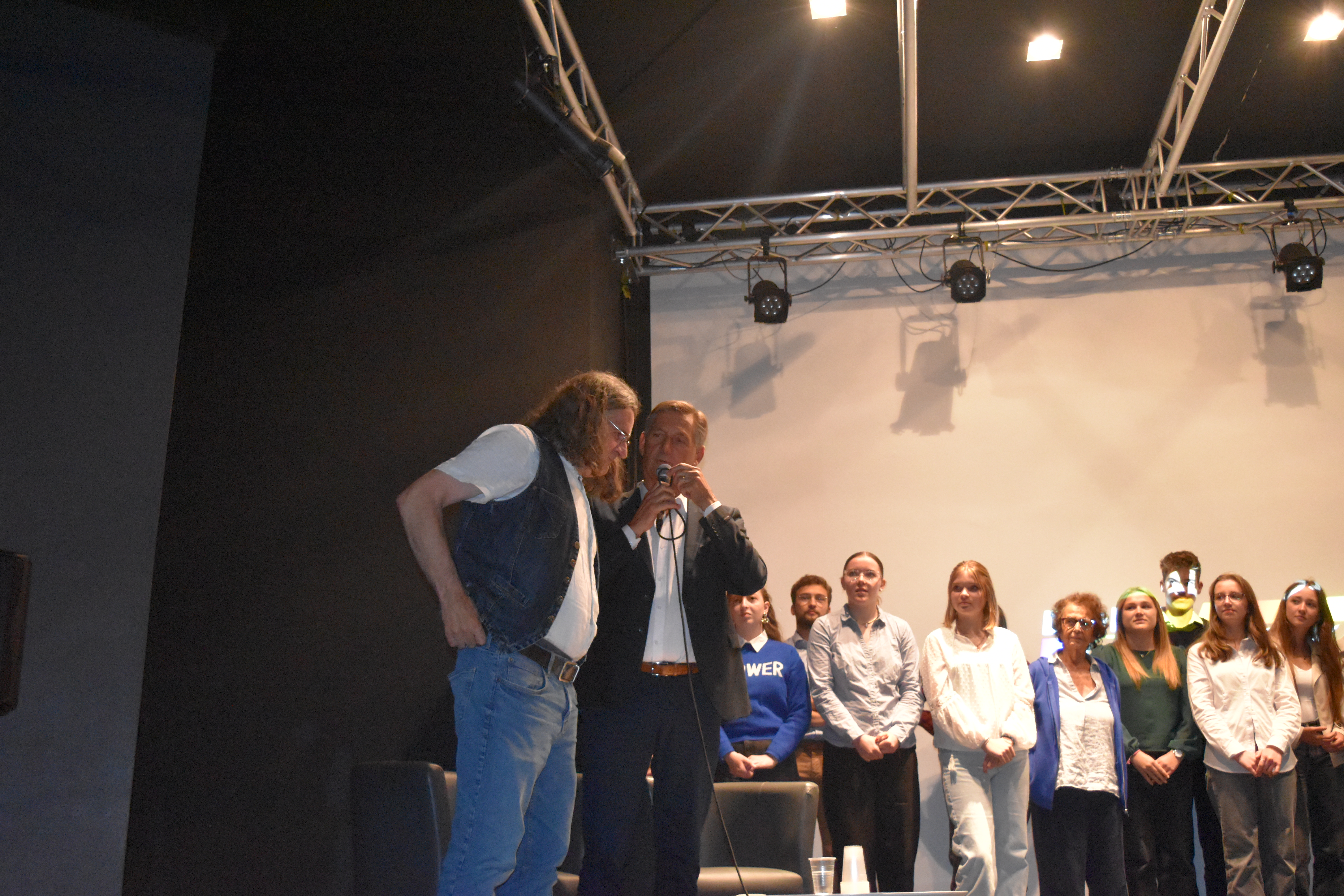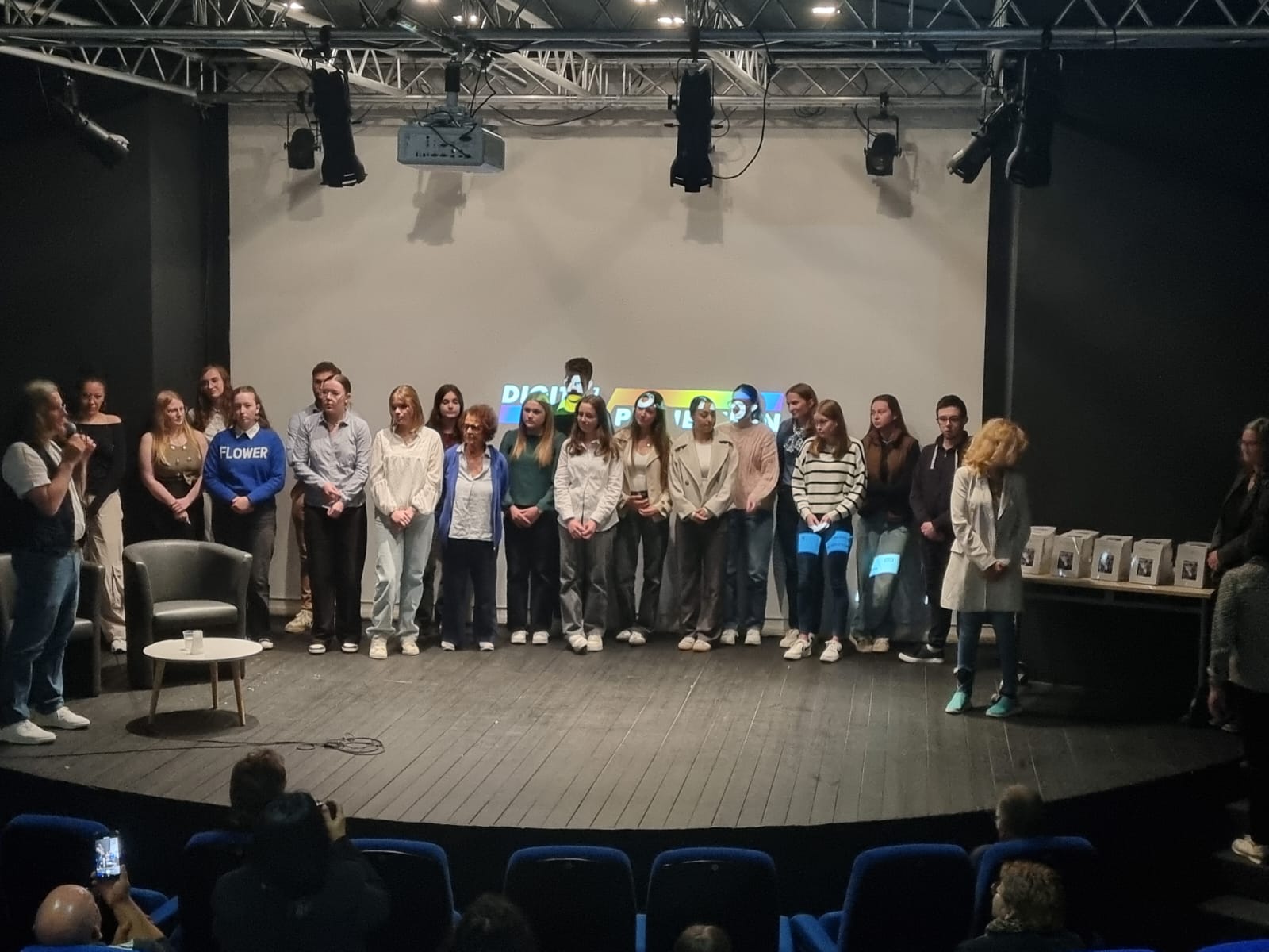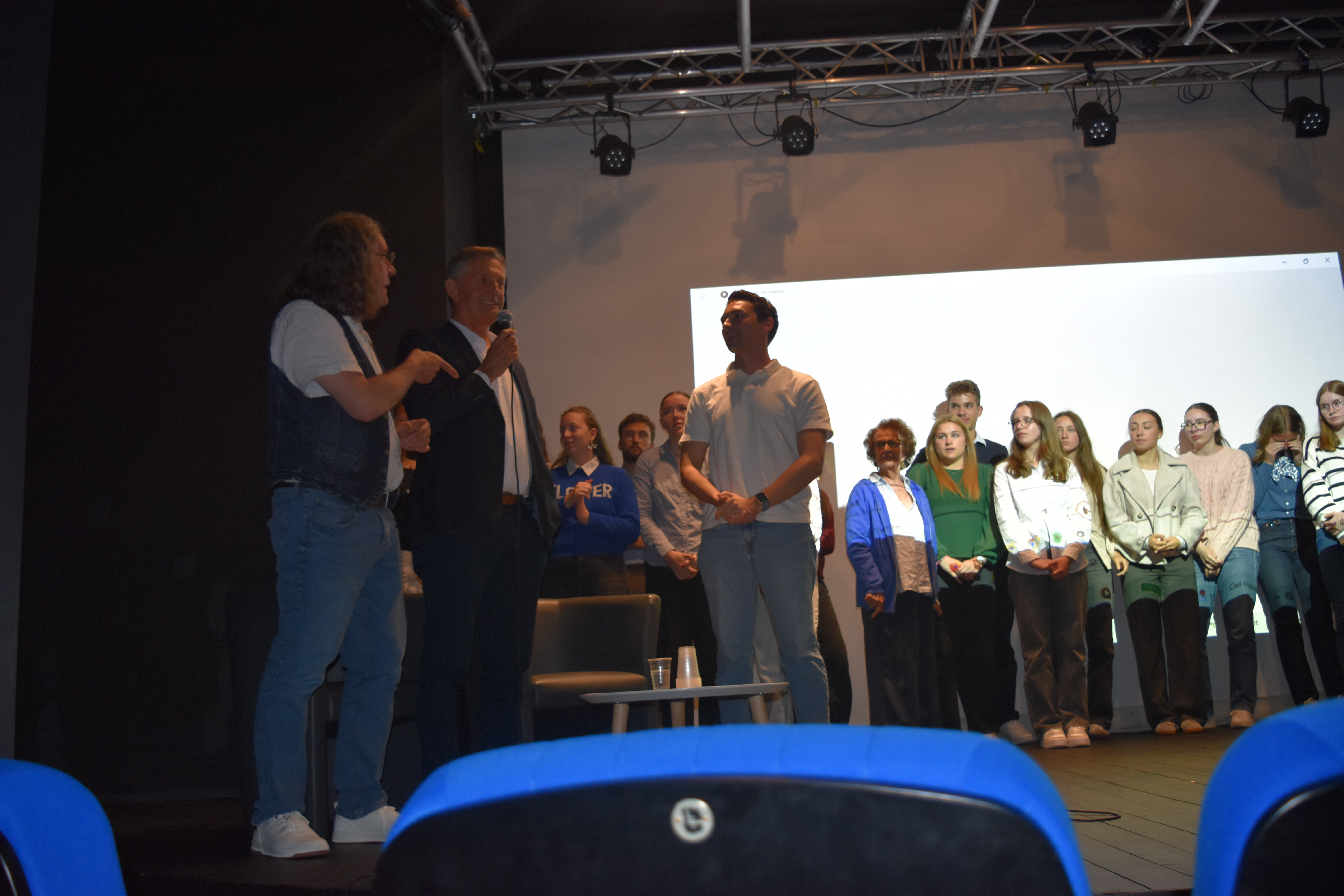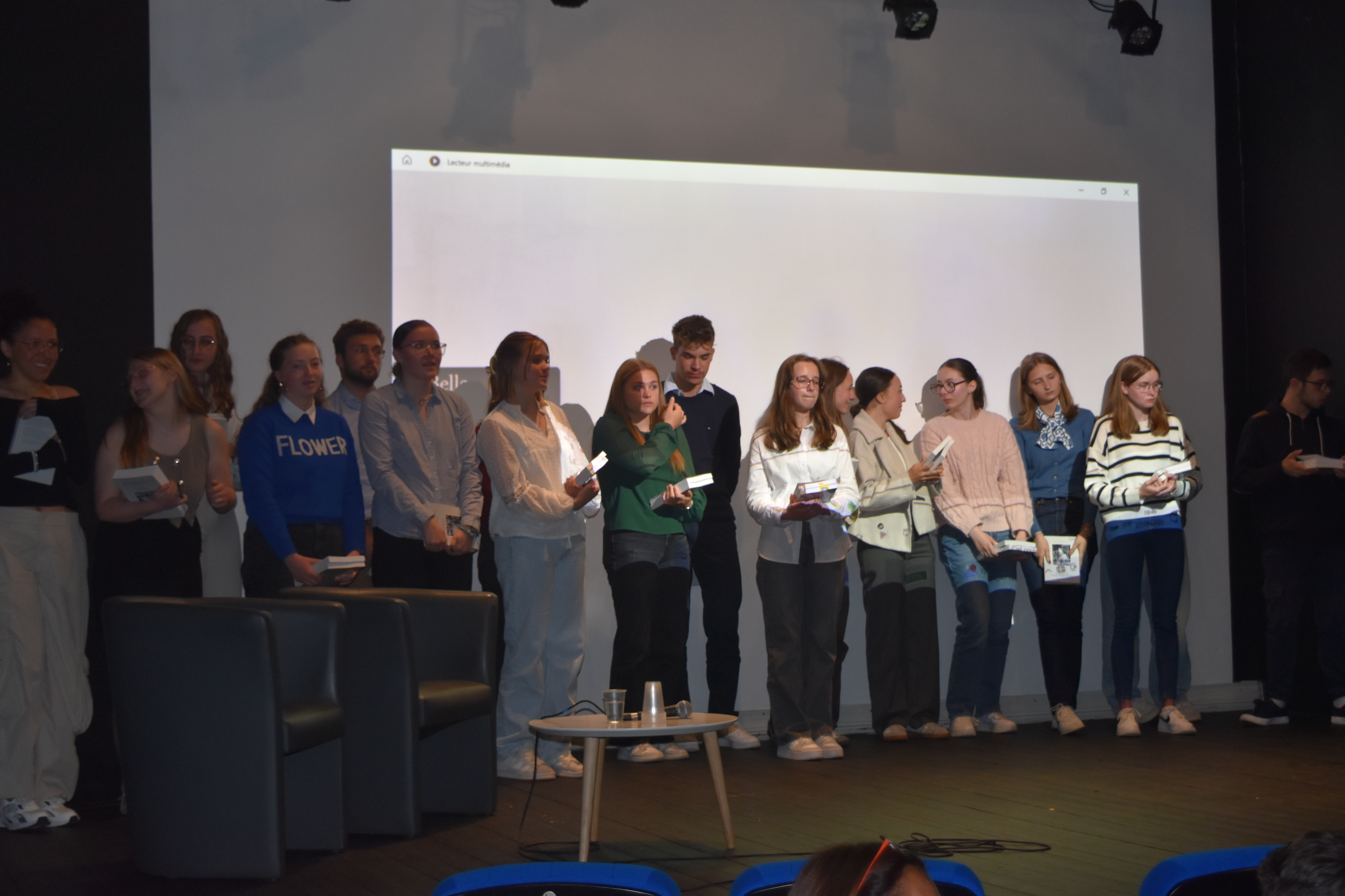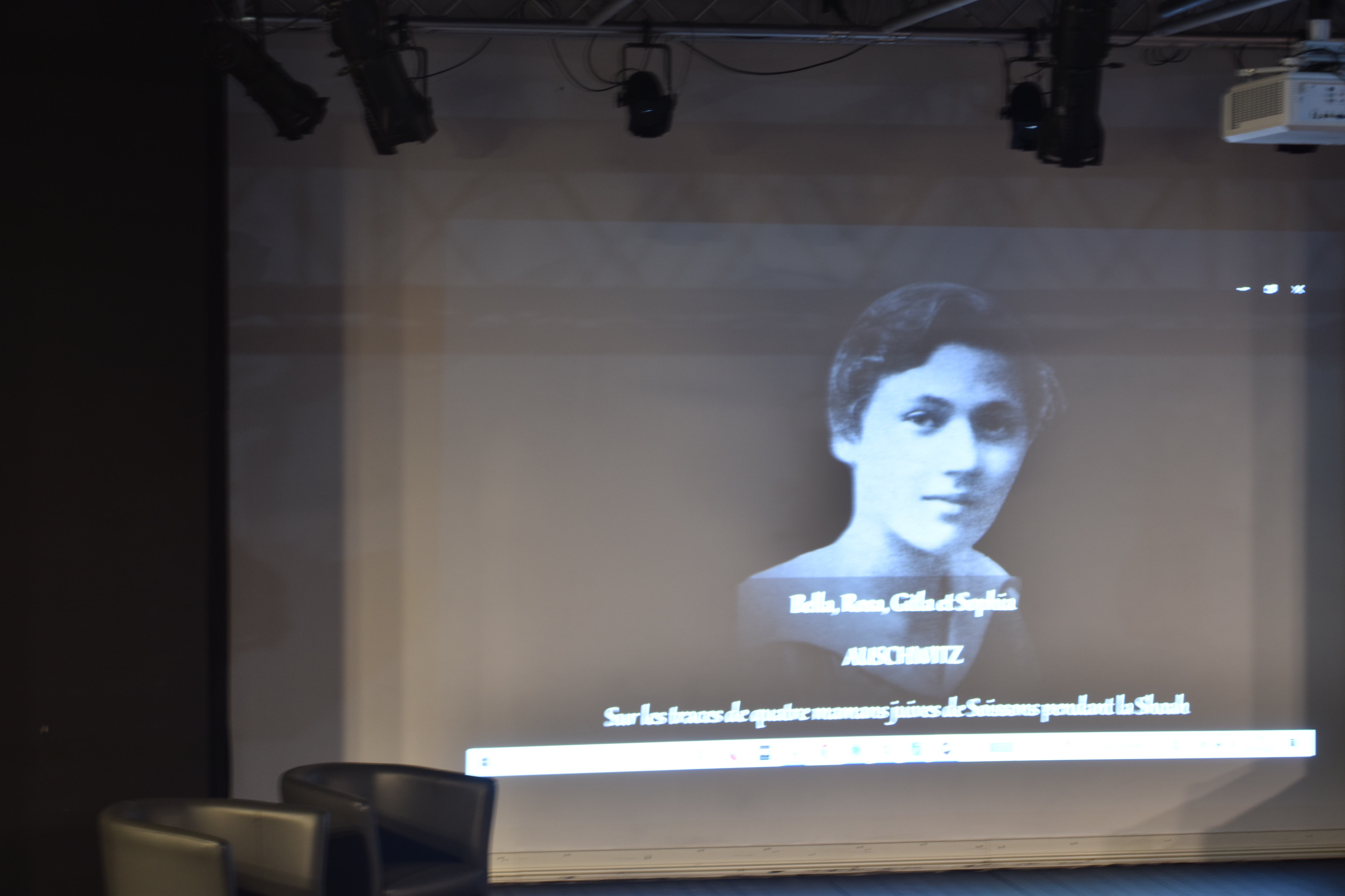 Les 130 sièges de l’auditorium sont quasi tous occupés et sur la scène, entourés de mes collègues, nous commençons à rappeler quelques aspects et la nature du projet. Puis, les lumières s’éteignent, je me dirige vers la console en bas de la scène pour lancer, en avant première, la projection de notre film documentaire, un long métrage d’1h23′ : Sur les traces de Bella, Rosa, Gitla, Sophia (et leurs proches) à Auschwitz. Je vous avoue que je n’en menais pas large. C’était la première fois que je me lançais dans la production (financée en grande partie le CARDIE du Rectorat d’Amiens), la réalisation, bref tout le montage, composition de la musique comprise pour plusieurs séquences. Mes inquiétudes se sont vites dissipées lorsque j’observais les visages de tous les spectateurs, complètement embarqués, pris par l’émotion, jusqu’au générique de fin. Les applaudissement nous firent très chaud au coeur. Notre plus grande satisfaction, c’est la sincère et profonde admiration de nos élèves à se voir et à s’entendre sur le grand écran. Ils découvraient, eux aussi, ce film dans son montage final qu’ils étaient impatient de voir.