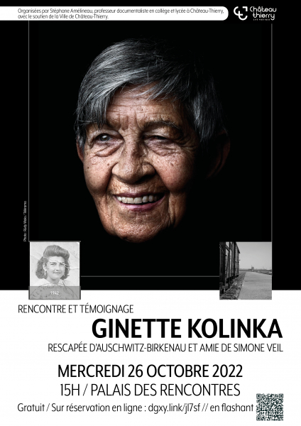 Mercredi 26 octobre 2022 : A 15h, j’organise avec le soutien de la municipalité de Château-Thierry, la venue de Ginette Kolinka, l’une des dernières survivantes d’Auschwitz-Birkenau, pour entendre son témoignage au Palais des Rencontres. Entrées gratuites mais sur réservation en ligne ICI dans la mesure des places disponibles (600).