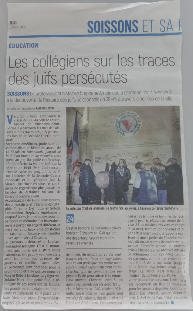 Quelques jours après cette rencontre, des élèves du collège Louise Michel ont croisé et interpellé Yolaine, petite-fille de Rosa Lewkowicz, arrêtée à Soissons le 20 juillet 1942 et déportée sans retour à Auschwitz le 31 août 1942. Yolaine était à mes côtés lors de notre déambulation dans les rues de Soissons. Adorables, ils lui ont dit : « Nous nous souviendrons toujours de l’intervention de monsieur Amélineau. Cela nous a beaucoup touchés. Nous avons aussi beaucoup apprécié votre témoignage, madame, et les réponses que vous nous avez dites à nos questions ! »