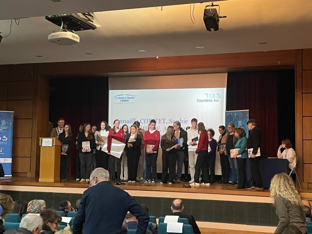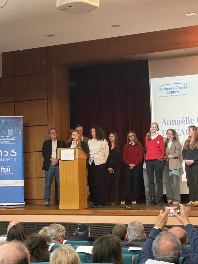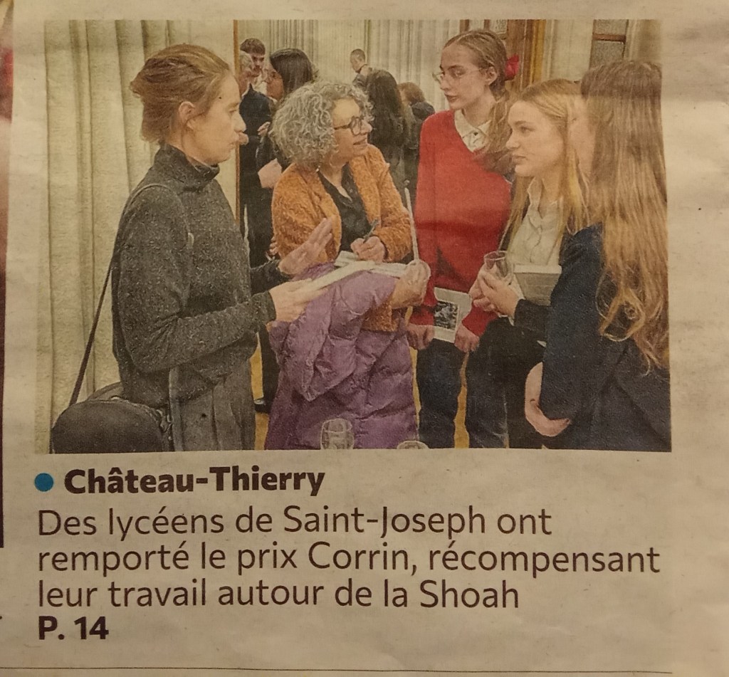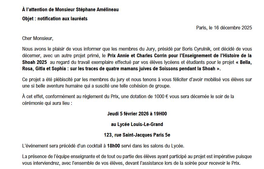 L’heureuse nouvelle commença par un coup de fil. Hasard ou coïncidence, je marchais dans Soissons après avoir rendu visite à Yolaine Huet, une petite-fille de Rosa Lewkowicz, l’une des quatre mamans de notre projet, lorsque que mon téléphone vibra dans la poche de mon pantalon : « Il y a plus difficile nouvelle à annoncer car j’ai la joie de vous apprendre que votre projet a reçu, à l’unanimité du jury, le Prix Corrin 2025. Nous vous recontacterons très vite pour l’organisation de la cérémonie qui se tiendra le 5 février 2026 au lycée Louis-le-Grand, Paris 5e« . Je rebroussais chemin pour annoncer à Yolaine cette merveilleuse délibération du jury. Je dois l’avouer, j’avais la voix en mode tremolo, tellement mes collègues et nos élèves avaient tant donné pour ce projet ! La confirmation tomba par un courrier officiel trois jours plus tard :