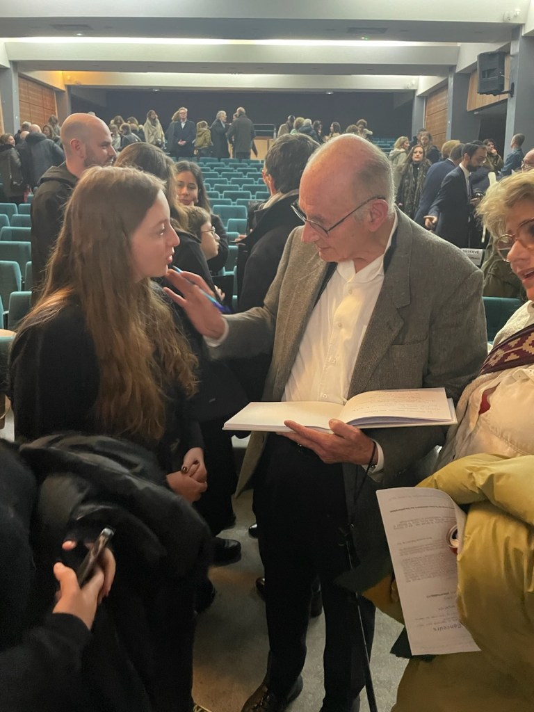 L’heure était venue de nous présenter au lycée Louis-le-Grand dans le 5e arrondissement où les élèves et les professeurs des quatre établissements scolaires primés pour cette édition étaient attendus pour un cocktail-buffet. C’était l’occasion pour tous ces lauréats d’échanger avec les membres du jury du prix Corrin, les membres organisateurs du Fond Social Juif Unifié (FSJU), des rescapés de la Shoah ou leurs descendants, et des médias présents. Dans un tourbillon de sollicitations, nos élèves ont su répondre avec justesse sur leurs ressentis de notre projet en offrant des exemplaires de notre livre Bella, Rosa, Gitla et Sophia. C’était aussi pour nous, l’occasion de retrouver les descendants de « nos » quatre mamans : Liliane et Jean-Claude Liwer, Nathalie Ostrowiak, Yolaine Huet, Viviane Harif et l’un de ses petit-fils, Elior. Vers 19h, l’appel retentit pour nous installer dans l’auditorium du lycée afin que la cérémonie puisse commencer.
