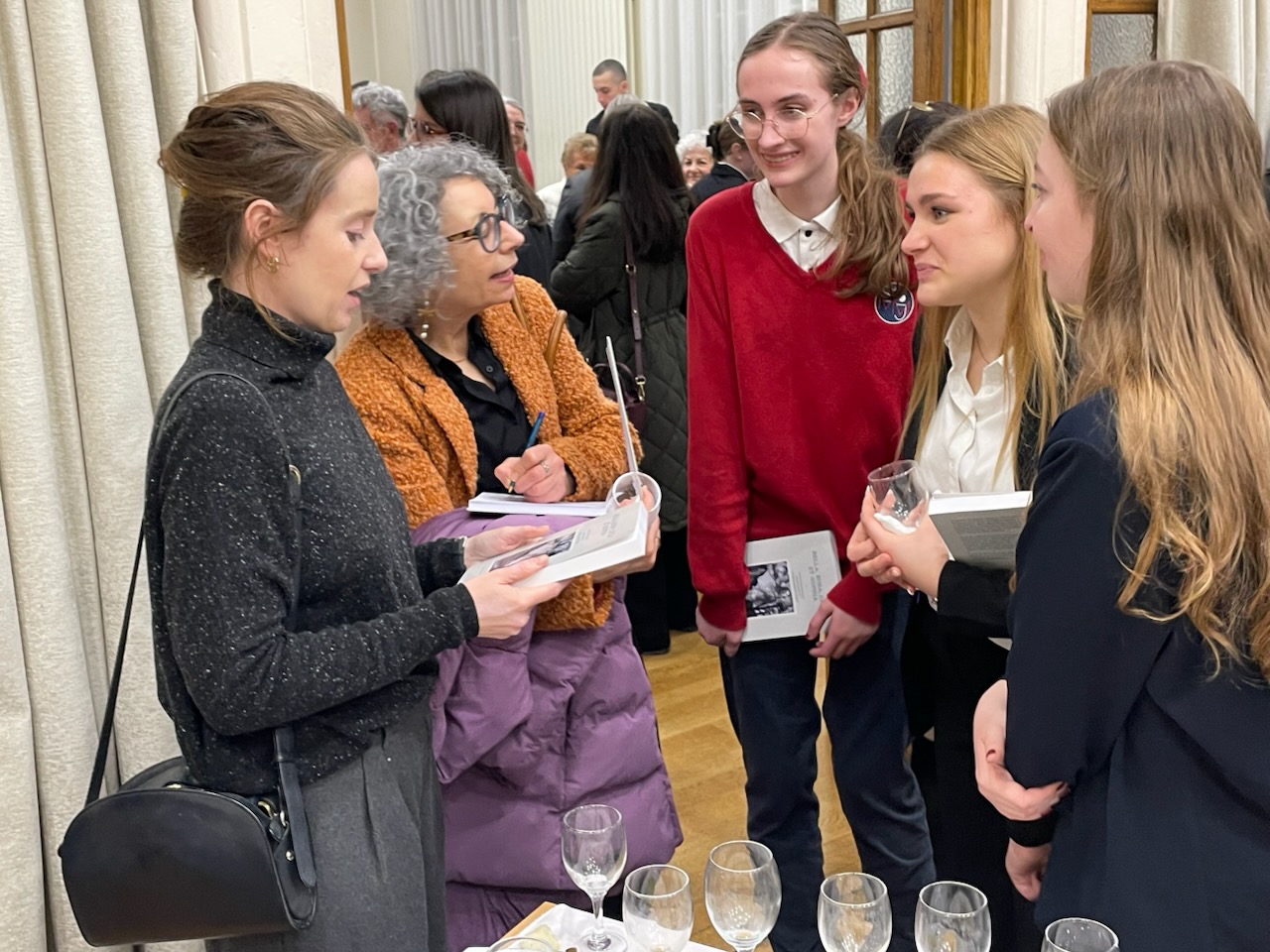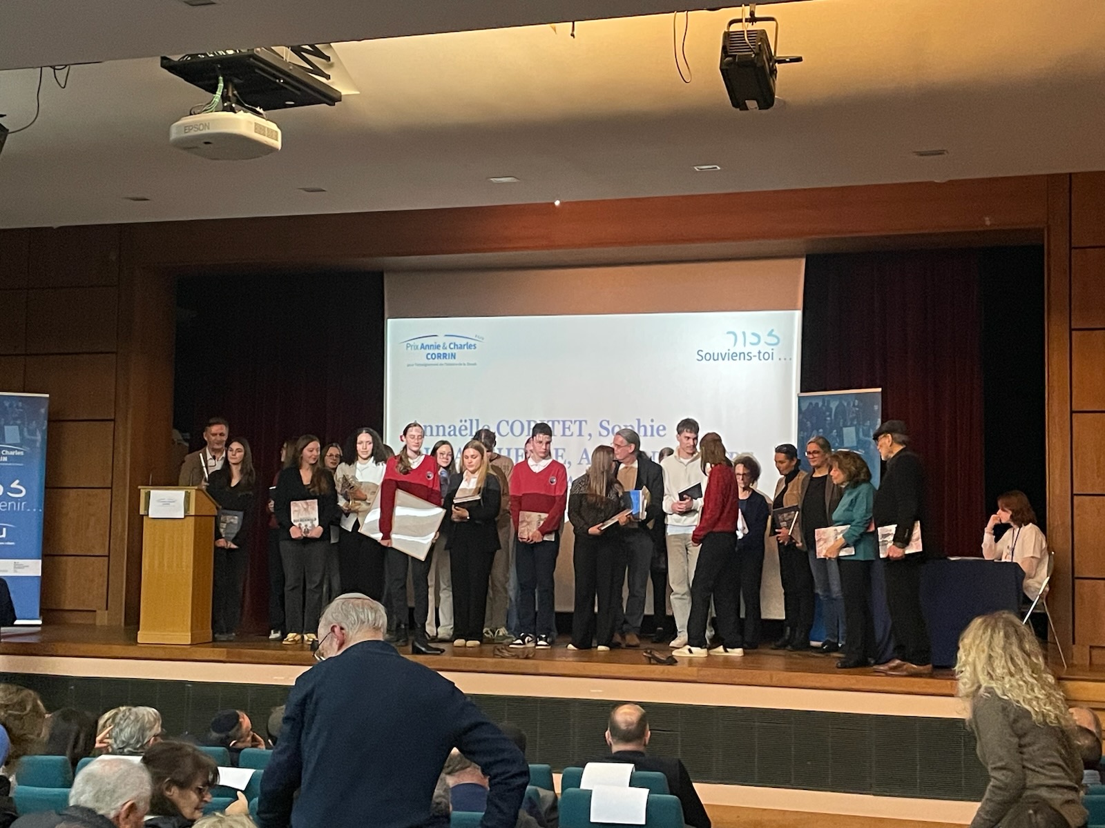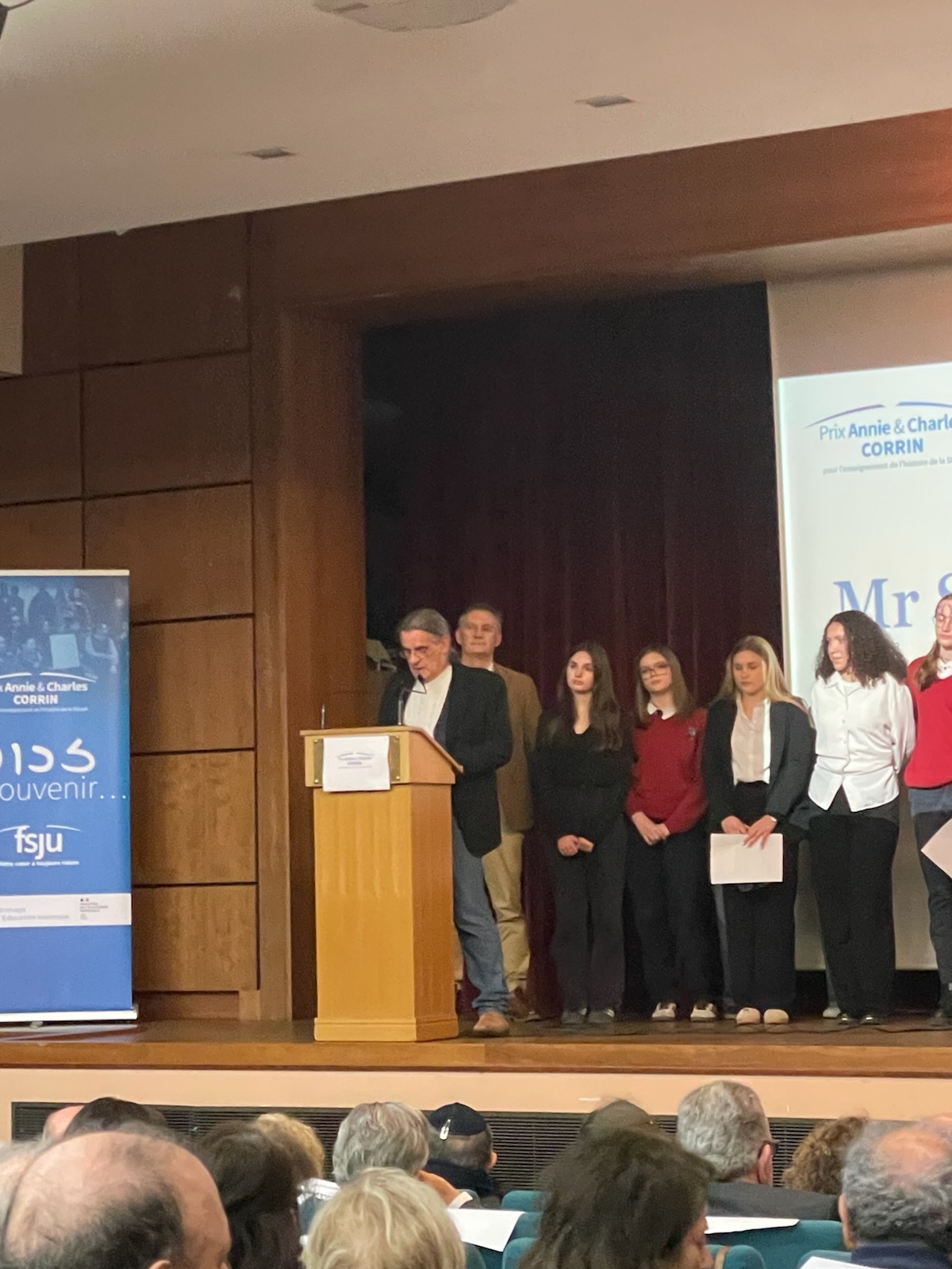 L’heure était venue de nous présenter au lycée Louis-le-Grand dans le 5e arrondissement où les élèves et les professeurs des quatre établissements scolaires primés pour cette édition étaient attendus pour un cocktail-buffet. C’était l’occasion pour tous ces lauréats d’échanger avec les membres du jury du prix Corrin, les membres organisateurs du Fond Social Juif Unifié (FSJU), des rescapés de la Shoah ou leurs descendants, et des médias présents. Dans un tourbillon de sollicitations, nos élèves ont su répondre avec justesse sur leurs ressentis de notre projet en offrant des exemplaires de notre livre Bella, Rosa, Gitla et Sophia. C’était aussi pour nous, l’occasion de retrouver les descendants de « nos » quatre mamans : Liliane et Jean-Claude Liwer, Nathalie Ostrowiak, Yolaine Huet, Viviane Harif et l’un de ses petit-fils, Elior. Vers 19h, l’appel retentit pour nous installer dans l’auditorium du lycée afin que la cérémonie puisse commencer.