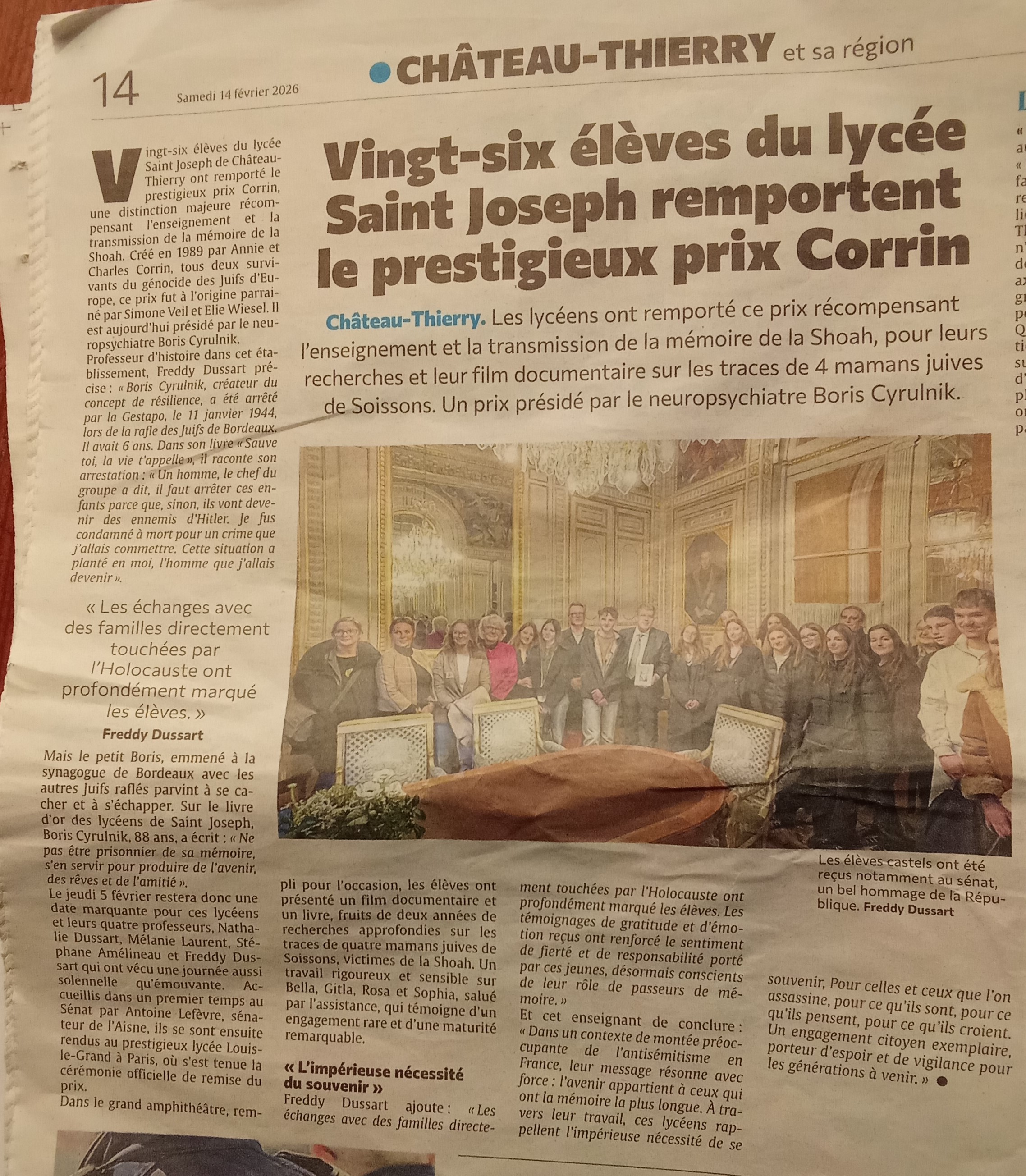 L’heureuse nouvelle commença par un coup de fil. Hasard ou coïncidence, je marchais dans Soissons après avoir rendu visite à Yolaine Huet, une petite-fille de Rosa Lewkowicz, l’une des quatre mamans de notre projet, lorsque que mon téléphone vibra dans la poche de mon pantalon : « Il y a plus difficile nouvelle à annoncer car j’ai la joie de vous apprendre que votre projet a reçu, à l’unanimité du jury, le Prix Corrin 2025. Nous vous recontacterons très vite pour l’organisation de la cérémonie qui se tiendra le 5 février 2026 au lycée Louis-le-Grand, Paris 5e« . Je rebroussais chemin pour annoncer à Yolaine cette merveilleuse délibération du jury. Je dois l’avouer, j’avais la voix en mode tremolo, tellement mes collègues et nos élèves avaient tant donné pour ce projet ! La confirmation tomba par un courrier officiel trois jours plus tard :